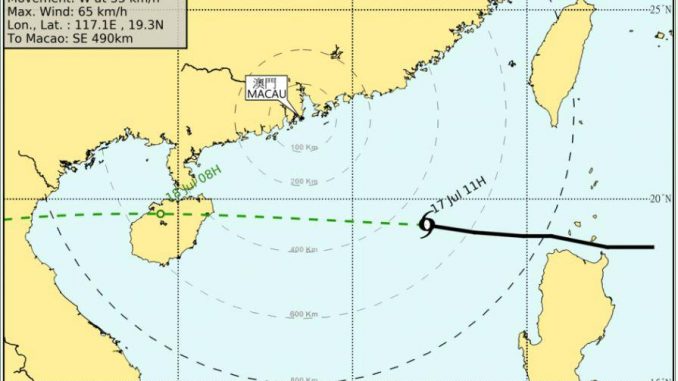 Entre as quatro e as sete da tarde, mais precisamente. Às onze da manhã, a tempestade – que segue em direcção a Hainão – estava situada a 490 quilómetros a sudeste de Macau, movimentando-se à velocidade de 35 quilómetros por hora.