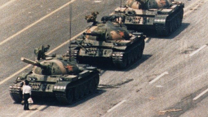 Na fotografia, que deu a volta ao mundo e se tornou uma das mais emblemáticas do século passado, aparece um homem a enfrentar uma coluna de tanques na avenida de Chang’An, como forma de protesto individual, depois de centenas de jovens morrerem naquela praça horas antes.