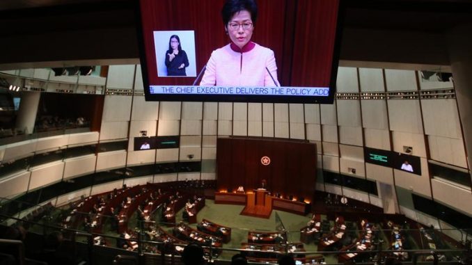 As palavras de Carrie Lam no Conselho Legislativo [parlamento local] parecem ser um apelo à contenção daqueles que protestam contra o que designam de reforço de controlo de Pequim sobre a vida cívica, económica e política da antiga colónia britânica.